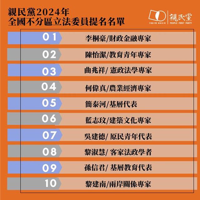 親民黨公布不分區名單 前立委李桐豪陳怡潔列前二名 (中央社記者王承中台北23日電)親民黨主席宋楚瑜今天公布親民黨2024不分區立委名單 ,排名第一為前親民黨立委李桐豪、第二是前親民黨立委陳怡潔。 這份名單共有10人,第三是台師大政治學研究所教授曲兆祥,之後依序為前大葉大學校長 何偉真、前嘉義縣議員簡泰河、中國科技大學建築系助理教授藍志玟、原民青年代表吳建 德、明新科大多元族群文化中心主任黎淑慧、基層教育代表孫信君,以及兩岸關係評論者 黎建南。(編輯:翟思嘉) https://www.cna.com.tw/news/aipl/202311230052.aspx https://i.imgur.com/VD0Endz.jpg