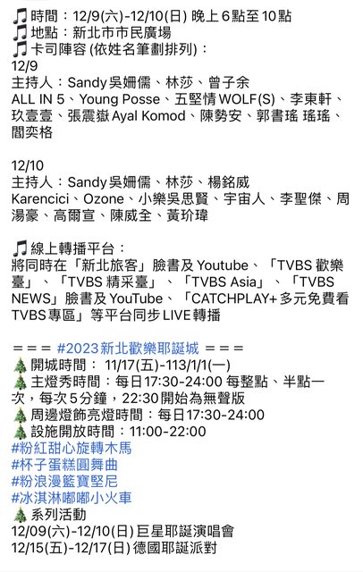 「2023新北歡樂耶誕城」在11月17日盛大開城,全台樂迷引頸期盼的「巨星耶誕演唱會-一