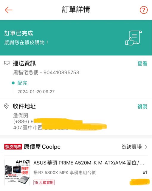2. Asus Prime A520M-K主機板,原廠保固至2027/01/19