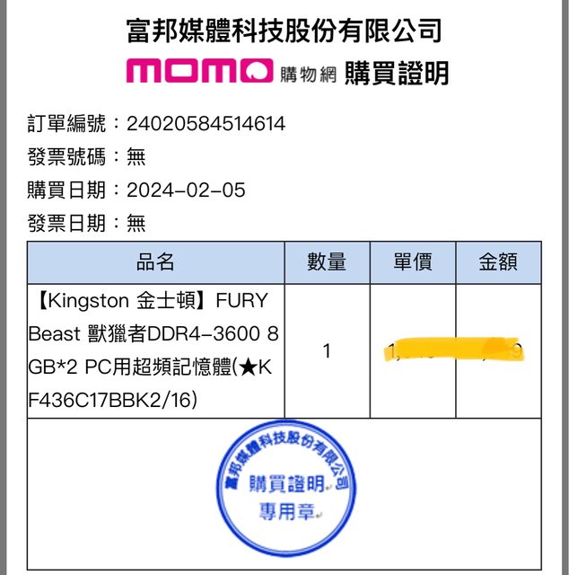 2. 兩條金士頓Fury Beast DDR4 3600mhz超頻記憶體共16G,原廠終身保固