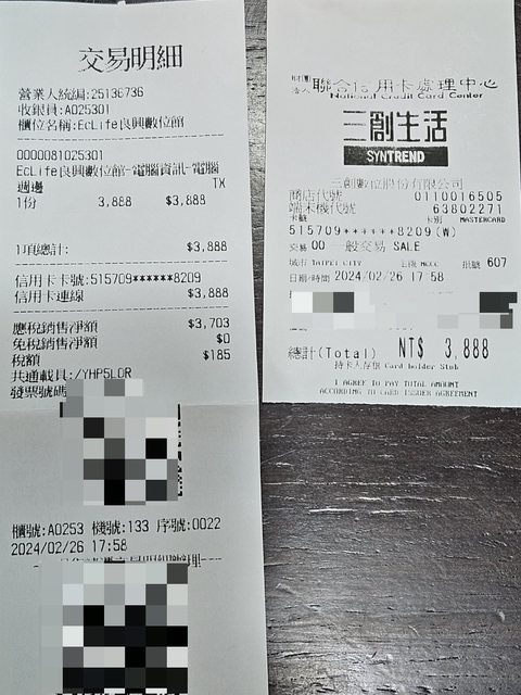 2.有3年保固,尚未註冊,隨機附上購買證明與信用卡簽單。