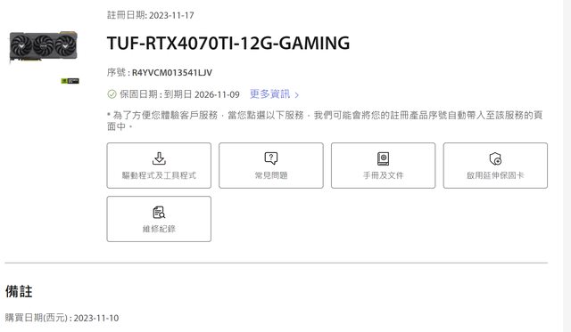 1.2023/11/10日購買,保固至2026/11/09 (已補註冊五年保 需要下個月才更新)
