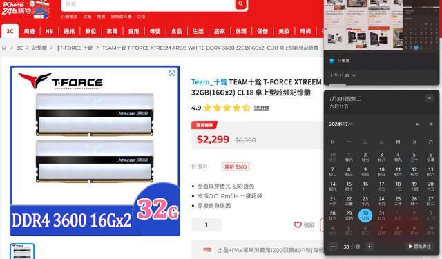 4. Team十銓 T-force Xtreem DDR4 16Gx2x2共64GB 3600Mhz