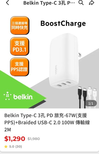 標題[賣/全國/皆可] Belkin Type-C 3孔 PD 旅充-67W(