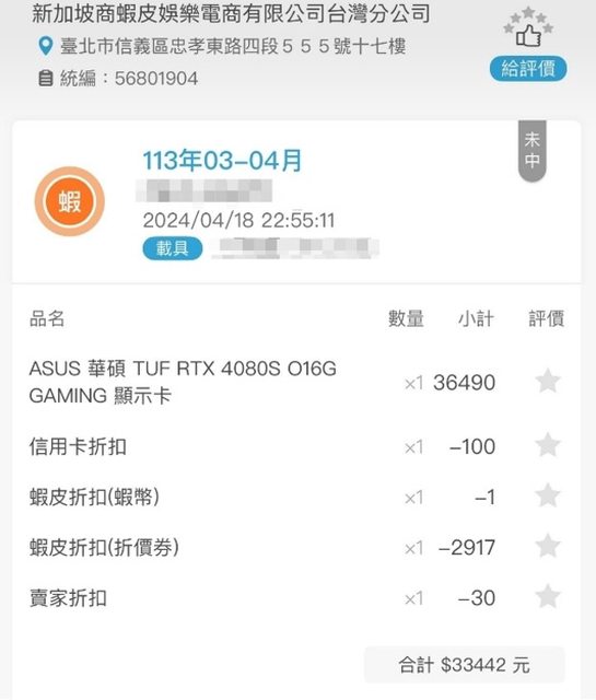 交易完成會附上完整的蝦皮電子發票