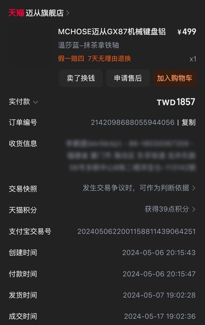 2. 2024/05/06天貓邁從旗艦店購買,水貨無保,僅開箱測試後收藏。