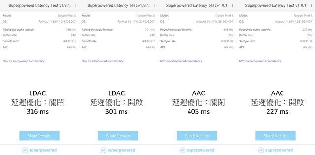 AAC 模式下開啟「音訊延遲優化」功能,雖然離人耳無法察覺的 100 ms 有段距離,但整