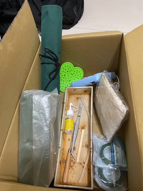 物品項目:花藝相關工具(花藝鐵絲、花藝海綿、熱融槍、長型花盆一個、紙膠帶*2、花