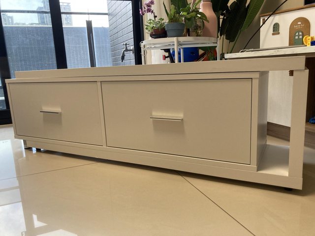 物品項目:白色櫃子,有兩個抽屜,長127cm(可伸長)寬30cm高39cm,使用約一年多。頂板和側板已分離,需自行用釘子固定!
