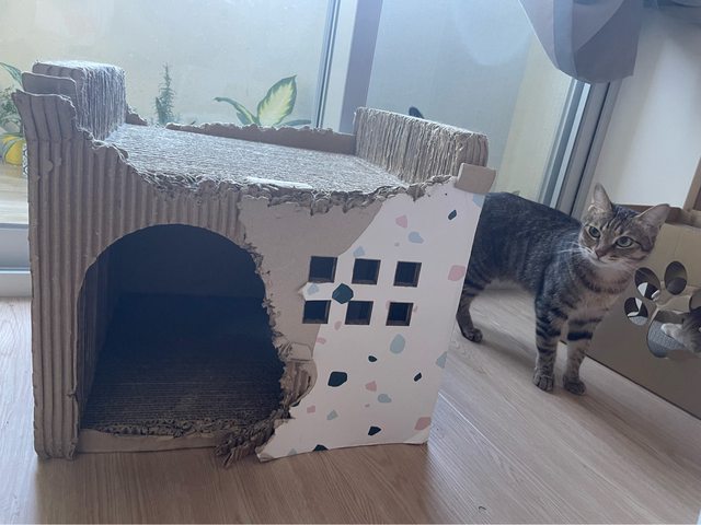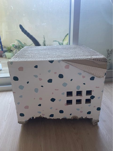 雖然已經被咬差不多了,但發現反過來擺貓咪還是愛進去。因為寵物展買新的,家裡沒什