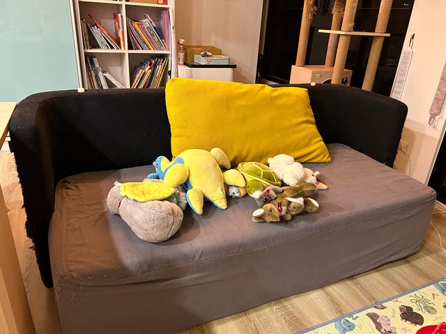 沙發邊邊角角的地方有貓抓痕,靠背翻下來可以當床。