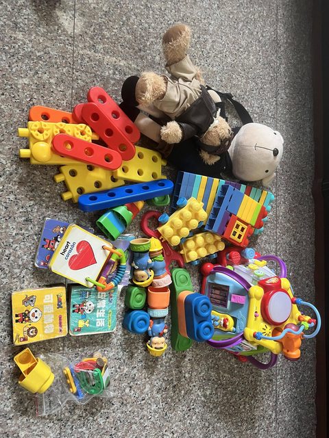 物品項目:Food超人方塊書4本+1英文小書、各式積木軟積木、匯樂15合一、包包、泰迪熊?