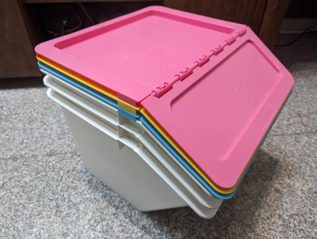 物品項目:收納箱3個,功能正常,紅黃藍各1,每個尺寸約寬37cm*深37cm*高30cm