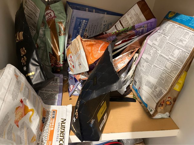 物品項目:各種品牌貓飼料的夾鍊袋、開封過的莫比貓飼料(貓咪不愛吃,然後放很久了