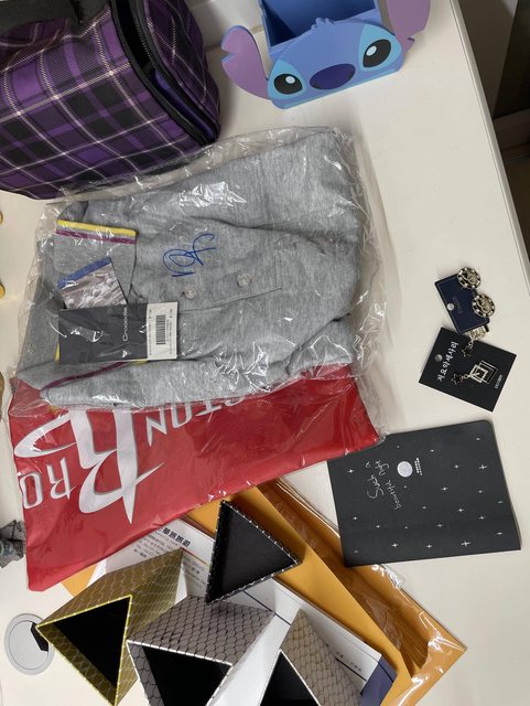 紫色格紋包包、三角筆筒有灰塵需清潔