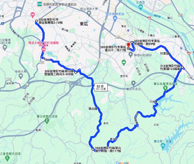 在寶山水庫左轉下山在二重埔接竹東中興路左轉,
