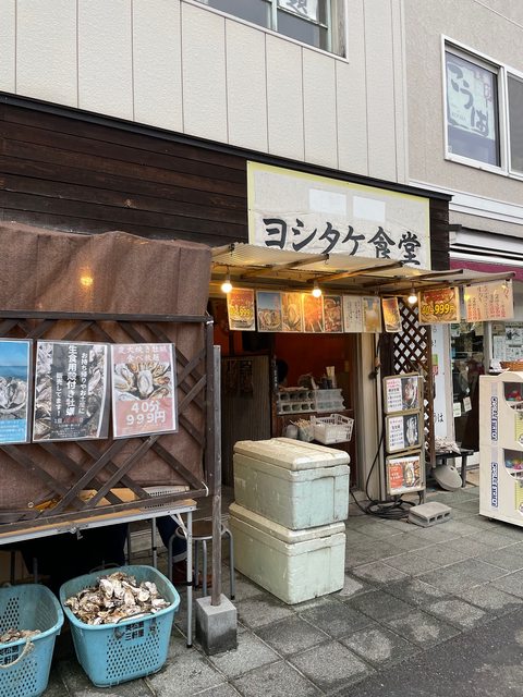 牡蠣小屋ヨシタケ食堂就在松島海岸車站對面,店外掛著價目表寫著40分鐘放題999日元