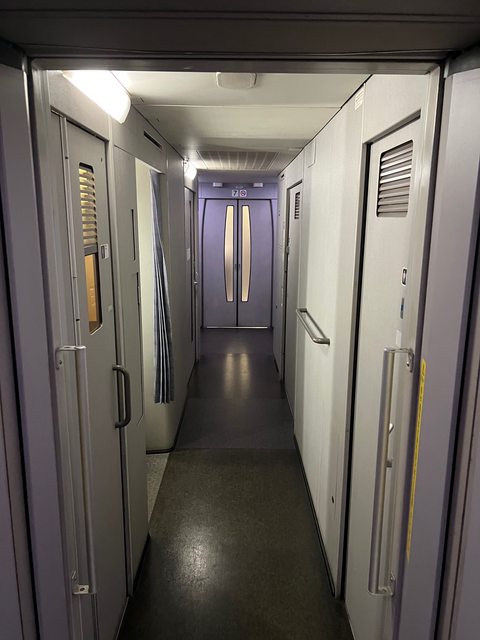 遷就於長長的錐狀車頭,首尾兩節車廂就能感受到空間的收束,可以從上方的行李棚架中