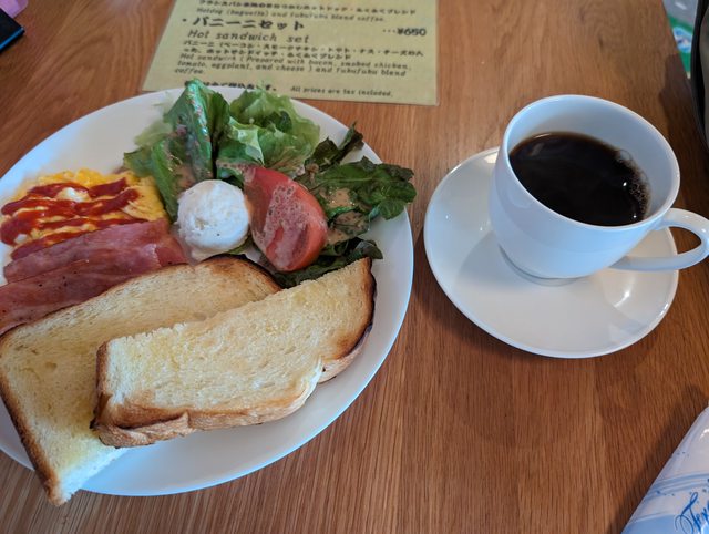 點了經濟套餐,包含奶油吐司、培根、沙拉、炒蛋跟綜合咖啡。價格是 600 日圓,味道