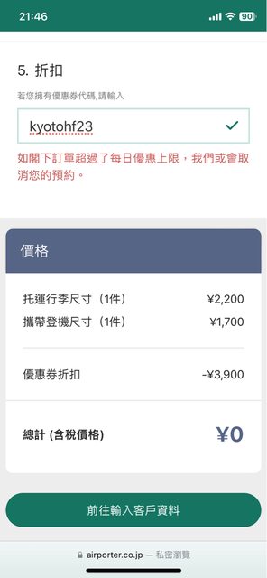 : 自行約行李運送 輸入折扣碼 首兩件免費