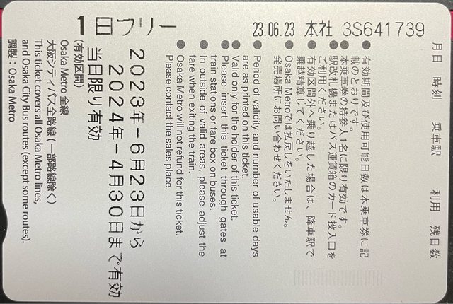 大阪地鐵巴士乘車一日券三張