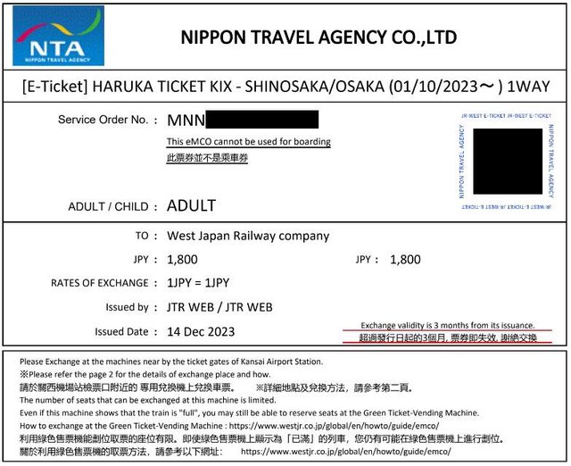 標題[讓售] 關西機場往新大阪/大阪HARUKA車票兌換券