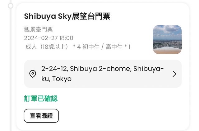 標題[讓售] 2/27 18:00 shibuya sky 門票*1