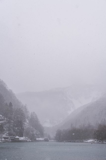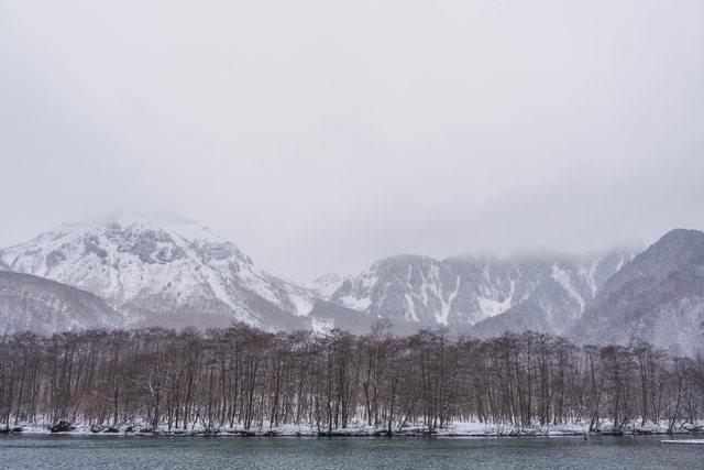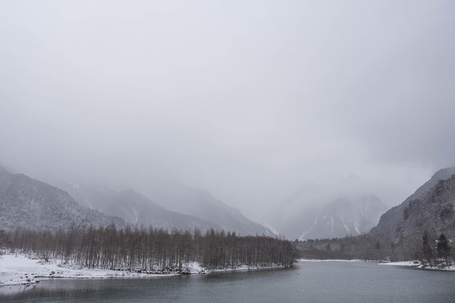 下雪中的大正池與遠方繚繞於山頂的雲,形成一片陰鬱的美景。