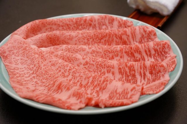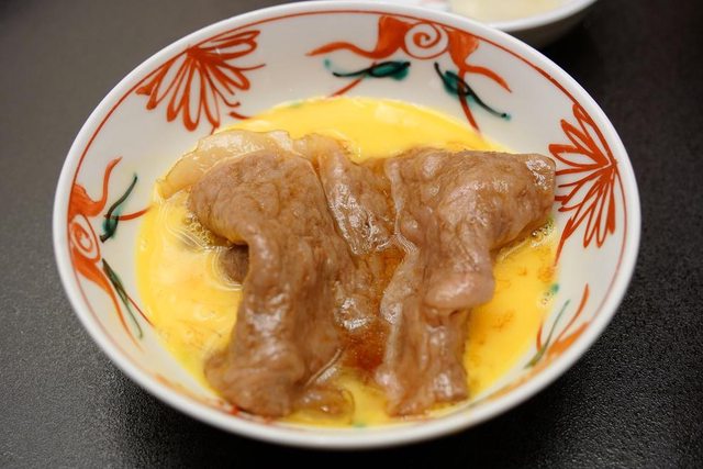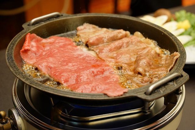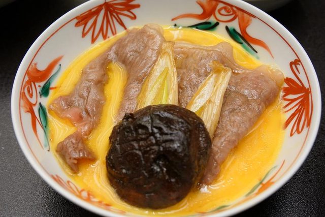 跟去年吃的大阪難波播重壽喜燒不一樣 播重是幫你煮第1片以後後續自己煮 人形町今半是全套都幫你煮