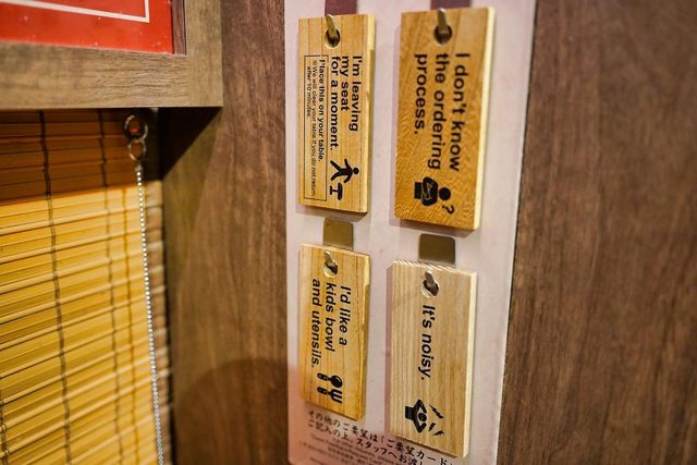 需要暫離一下、不知道怎麼點、需要小孩碗、覺得太吵等 都可以用牌子跟店員說
