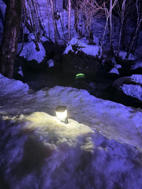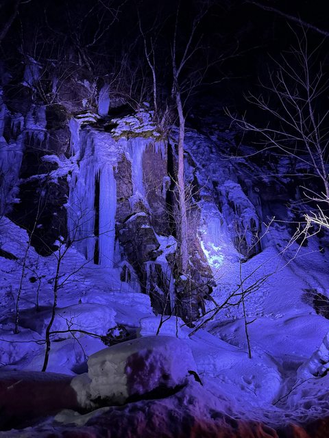 然後旁邊的冰瀑晚上打燈很好看,泡在室外湯的時候,一陣風吹過來,
