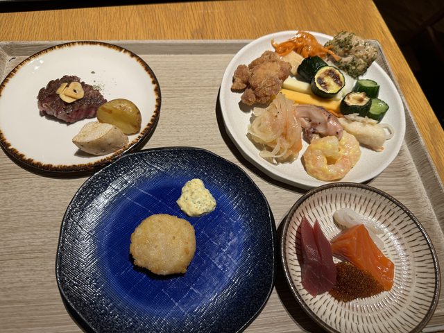推薦幾個餐點,晚餐:牛排、炸干貝、蘋果塔、帆立貝咖哩、仙貝汁、生魚片、三種蘋果汁。