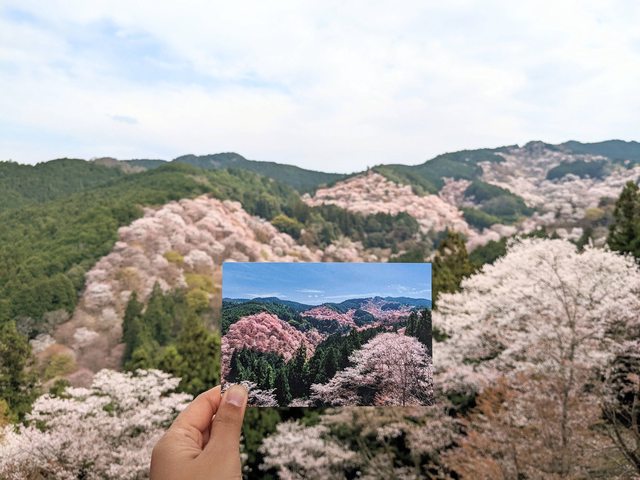 在這裡當然是要瘋狂拍照,人很多要排隊才能拍,大家都擠在一起XD 拿著我的明信片跟後面一整片櫻花拍照超棒!