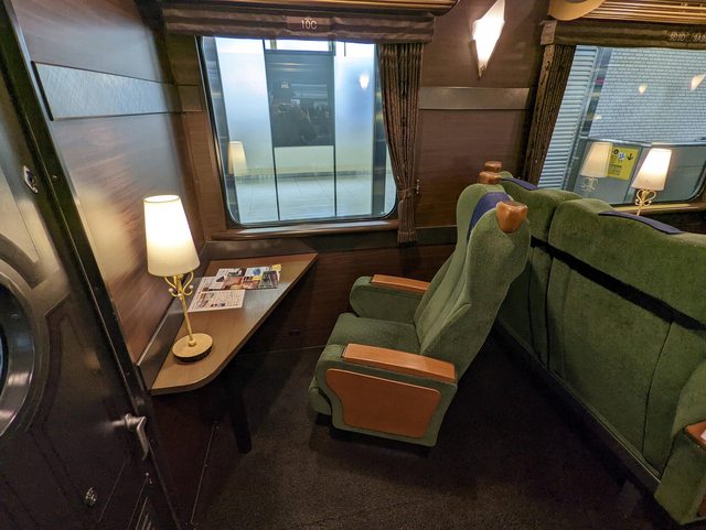 9:45青之交響曲就進站了,大家開始瘋狂拍照,來了一群日本阿公阿嬤,他們跟團參加還有導遊帶著他們,幾乎要包下整個車廂。座位有分單人座、雙人座、四人座,在買特急券的時候就會選好座位,有單人座對獨旅真的很棒!單人座有自己的空間,小桌子和檯燈加上旁邊的窗戶,整個氣氛超好~