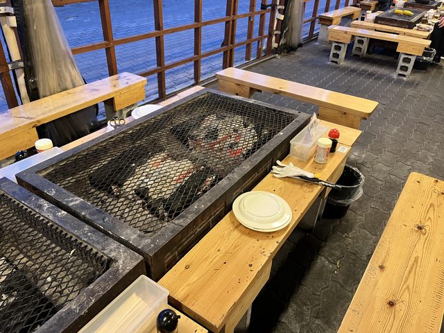 自己前往肉區、魚區、酒區、主食區購買食材後到爐火上烤,爐火很大所以兩個人一定會