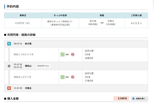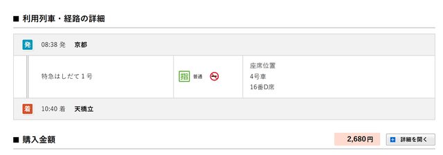 特急券為新大阪---天橋立,PASS或售票系統