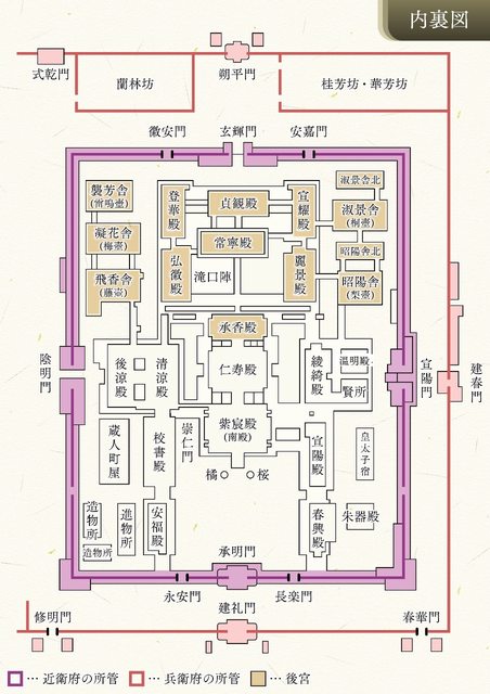 理政事之處,北邊則是后妃居住的地方。一開始,天皇本來是居住於仁壽殿,但從平安中