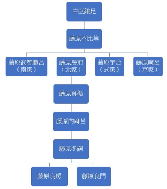 藤原不比等繼承「藤原」姓氏。不比等死後,其四個兒子分別分家成南家、北家、式家、