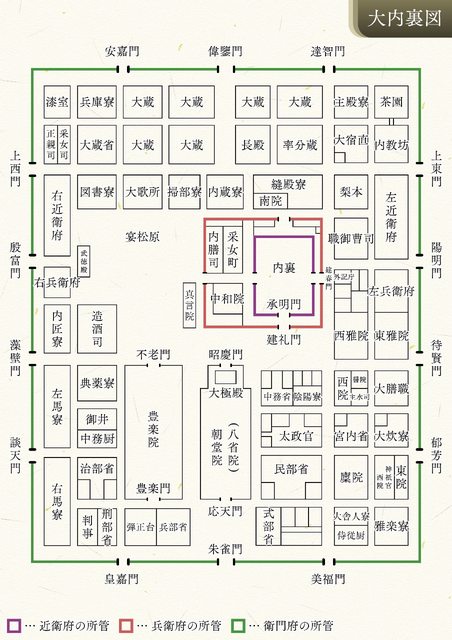 -天皇後宮介紹:平安京中,朝廷中各個官廳集中於所謂的「大內裏」中,而天皇與其后