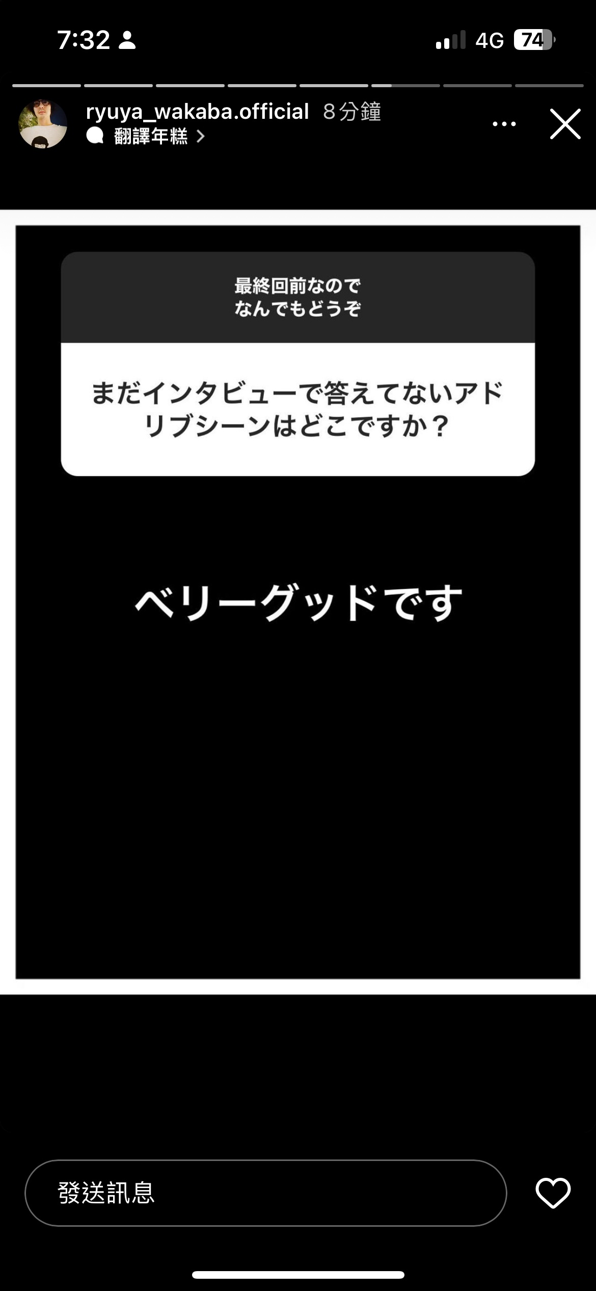 → FanFantasy: 情QQ若葉竜也有在instagram提問箱說very good是他的即 06/28 14:30