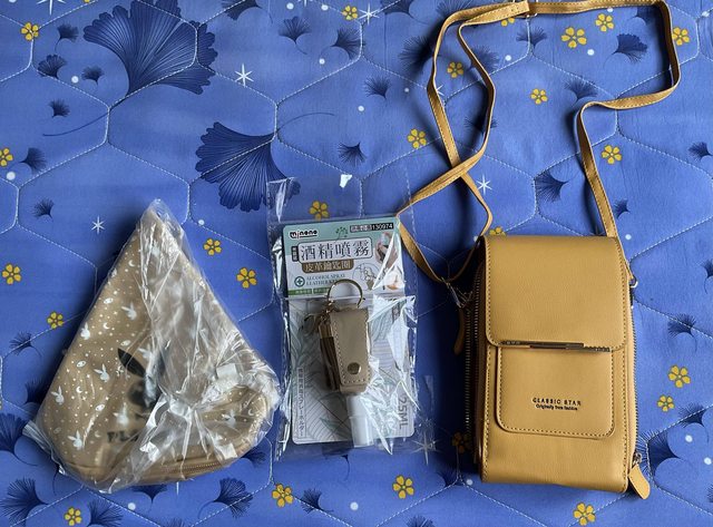(A.Playboy零錢包/B.小型噴瓶/C.皮製長夾/D.U形海綿枕心/E.U形乳膠枕心)