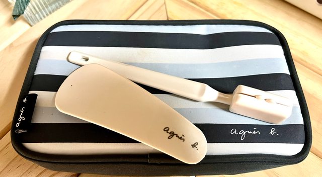 物品名稱:agnes b. 小收納包,外觀有使用痕跡,內含有未使用過的牙刷+ 小鞋把。
