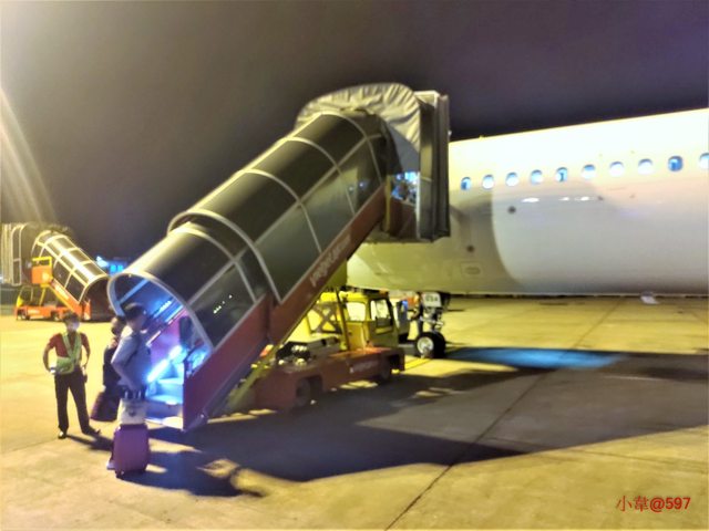 在小港是走空橋到飛機上入座,抵達內排機場後搭捷泊車到入境大廳。