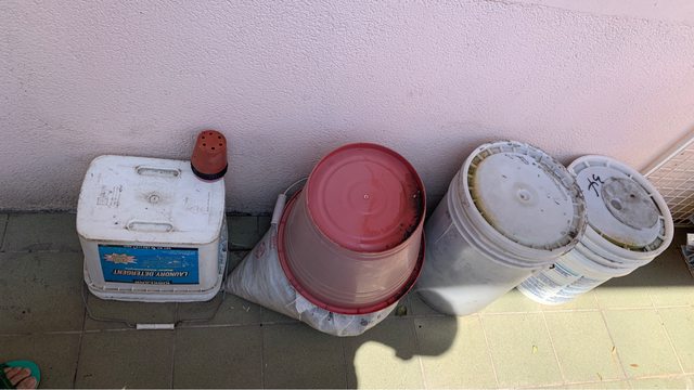 物品名稱:種植土及種植用盆子和水桶,白色桶子裡都是種植土,爬藤鐵網等