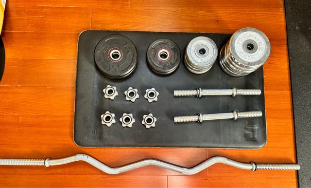 1. 35cm短桿*2、1.2米彎舉桿*1、1.25槓片*2、1.5kg槓片*4、2.5kg槓片*8片