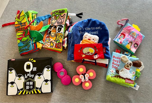 1.寶寶布書10本+旋轉陀螺2個+黑白視覺卡+洗屁屁神器+踢踢琴+Bibs丹麥奶嘴1個