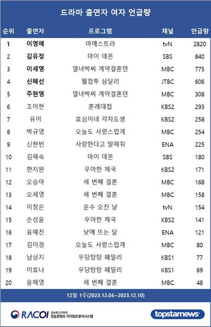 023.12.10)電視劇演員綜合排名中,tvN的李英愛(2,820分) 《Maestra》在網路反應中排