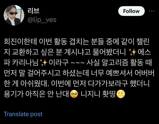 ,在Algorithm宣傳期間第一次和Karina說話,因為Karina太漂亮了,而導致講話結結巴