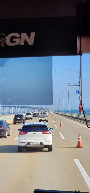 公路巴士駛過海上的仁川大橋十分美麗。