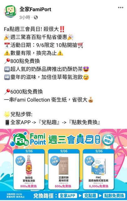 活動時間:9/6 週三早上十點 位置: 全家APP>點數免費換 優惠內容: 800點免費換奶酥奶茶、加倍佳草莓氣泡飲 6000點免費換全家衛生紙 https://i.imgur.com/YKwN7co.jpg